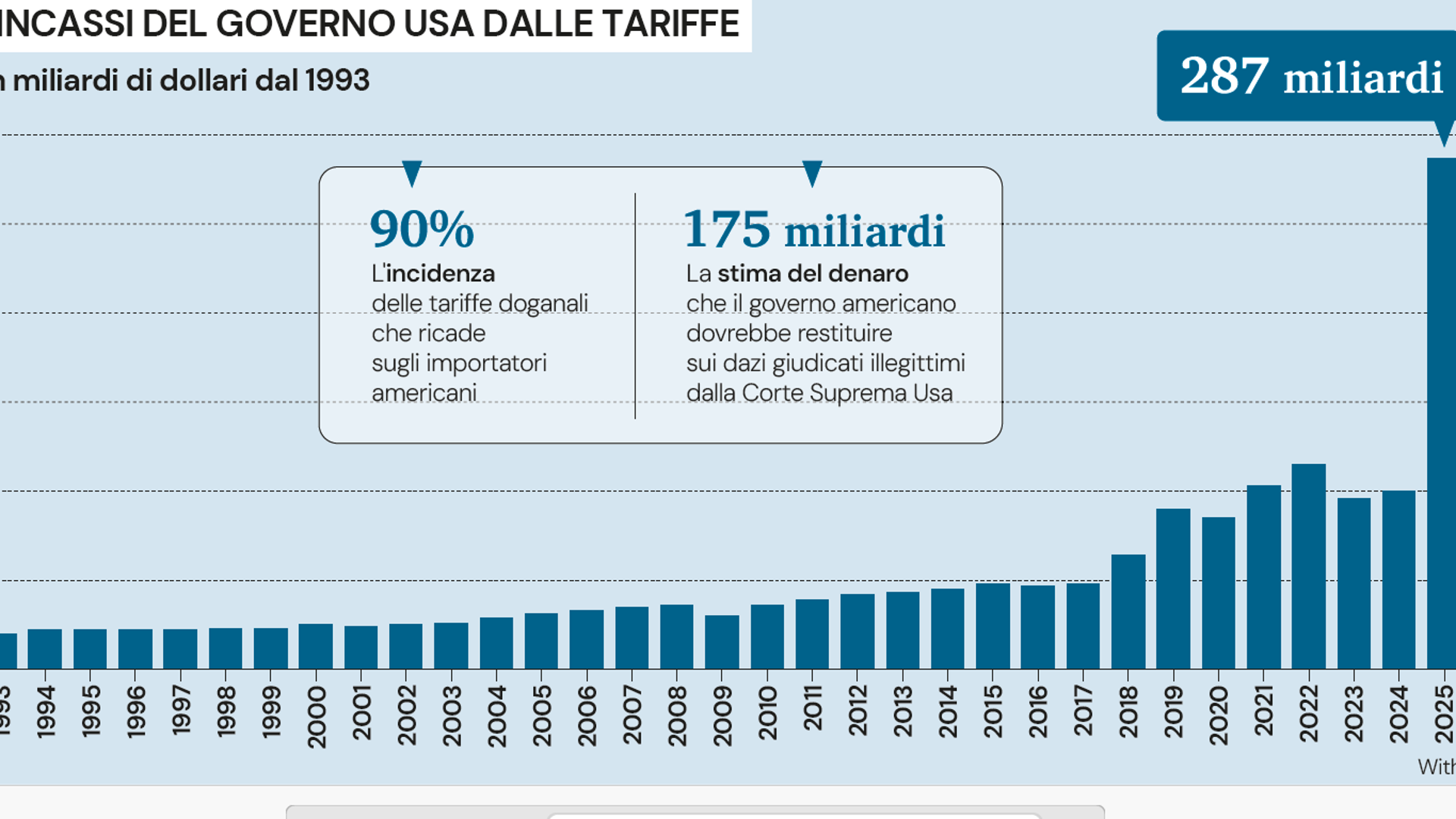La decisione della Corte Suprema di rendere illegali le tariffe doganali decise da Trump è una boccata di ossigeno per chi spera ancora che il sistema istituzionale americano sia ancora dotato dei necessari controlli e contrappesi ai super poteri del Presidente. Trump riteneva di poter aggirare il Congresso per ragioni di sicurezza nazionale, ma il fatto che le tariffe sono state erette contro tutti i paesi partner, e sulla base di considerazioni che riguardano i livelli dei saldi commerciali bilaterali o l’afflusso di droghe, dimostra che la sicurezza nazionale è solo un pretesto per conseguire obiettivi economici e politici di altro genere. Probabilmente, la decisione della Corte non obbligherà il Presidente ad abbattere i dazi indiscriminatamente e di usare norme che limitano le importazioni di specifici prodotti per i quali è possibile invocare questioni di sicurezza, magari appoggiandosi alla maggioranza di cui egli dispone al congresso. Ma il colpo per l’amministrazione Trump è notevolissimo. Si afferma il principio che i poteri d’intervento del Presidente sulle questioni commerciali devono essere approvate democraticamente e sulla base di motivazioni specifiche. Inoltre, è possibile che il governo Usa possa essere costretto a restituire ai contribuenti americani il gettito prodotto dalle tariffe illegali (circa 200 miliardi di dollari). Un colpo ulteriore alla credibilità dei programmi fiscali del presidente e alla stabilità del dollaro.