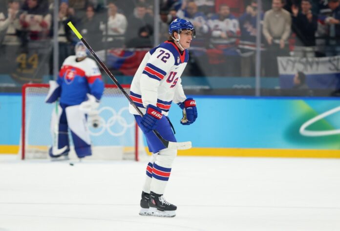 Tage Thompson was not on the bench to start the third period of Team USA’s semifinal bout against Slovakia on Friday night at Santagiulia Arena.