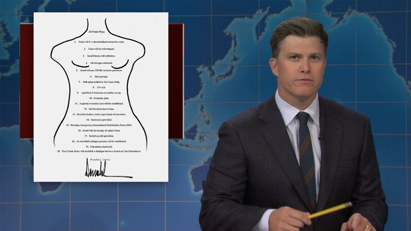 The first episode this season had a great sight gag delivered by Colin Jost when he said “Israel and Hamas have tentatively agreed to President Trump’s plan to end the war in Gaza. And you could tell Trump wrote the plan himself.”