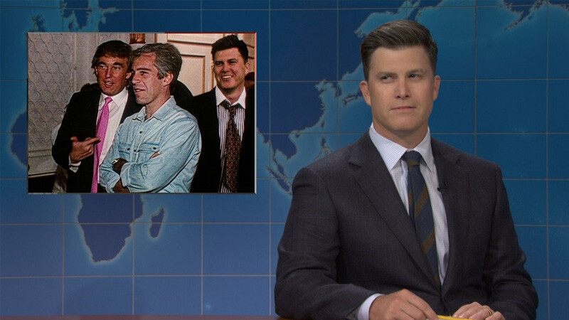 Che throws to that famous clip of best pals Donald Trump and Jeffrey Epstein laughing together at a party. As Trump points to an offscreen woman, Colin Jost comes dancing into frame as though he’s a partygoer. He even doubles in laughter at the same time Epstein does.
