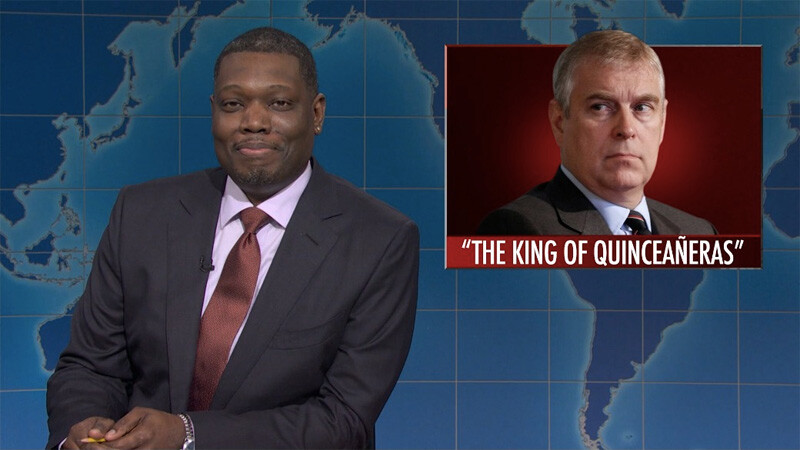 Che throws to that famous clip of best pals Donald Trump and Jeffrey Epstein laughing together at a party. As Trump points to an offscreen woman, Colin Jost comes dancing into frame as though he’s a partygoer. He even doubles in laughter at the same time Epstein does.