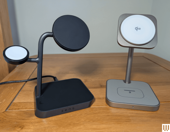 QDOS SnapStand 3-in-1 for £80: This clever design feels sturdy and comes flat, and you can fold out and angle a magnetic pad for charging your iPhone (StandBy mode works fine). There’s a pop-out Apple Watch charger around the back, and the base has a pad for your AirPods. You get a black USB-C cable, but you’ll need a charger (at least 25W). I like that it’s partly made from recycled materials, and it folds away very neatly, but the charging speeds are relatively slow (7.5 watts for the iPhone and 2.5 watts for the Apple Watch).