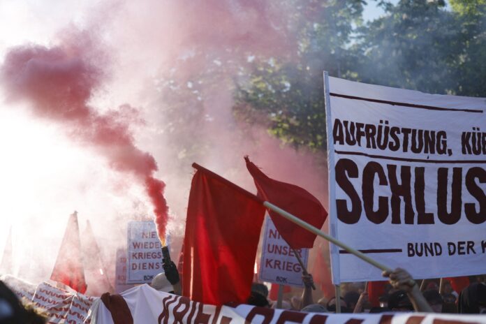 A red smoke flare is seen at the Revolutionary 1st of May demonstration in Berlin’s Kreuzberg on May 1st, 2025. (Photo by Odd ANDERSEN / AFP)
