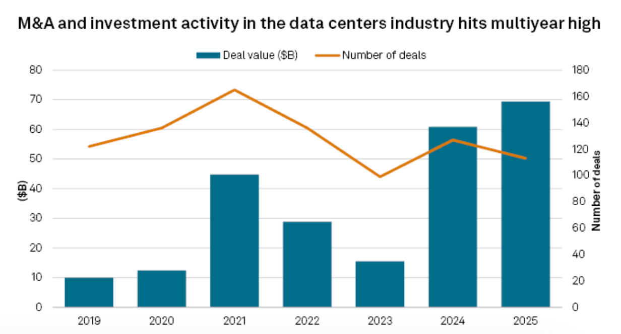 The demand for data center transactions remains robust in 2026, with more capital chasing a dwindling pool of assets, according to S&P Global Market Intelligence. Last year, 113 data center deals were completed, totaling over $69 billion, surpassing the previous year’s record by approximately $8 billion. Notable mega deals, including the $40 billion acquisition of Aligned Data Centers LLC, significantly contributed to this total.
