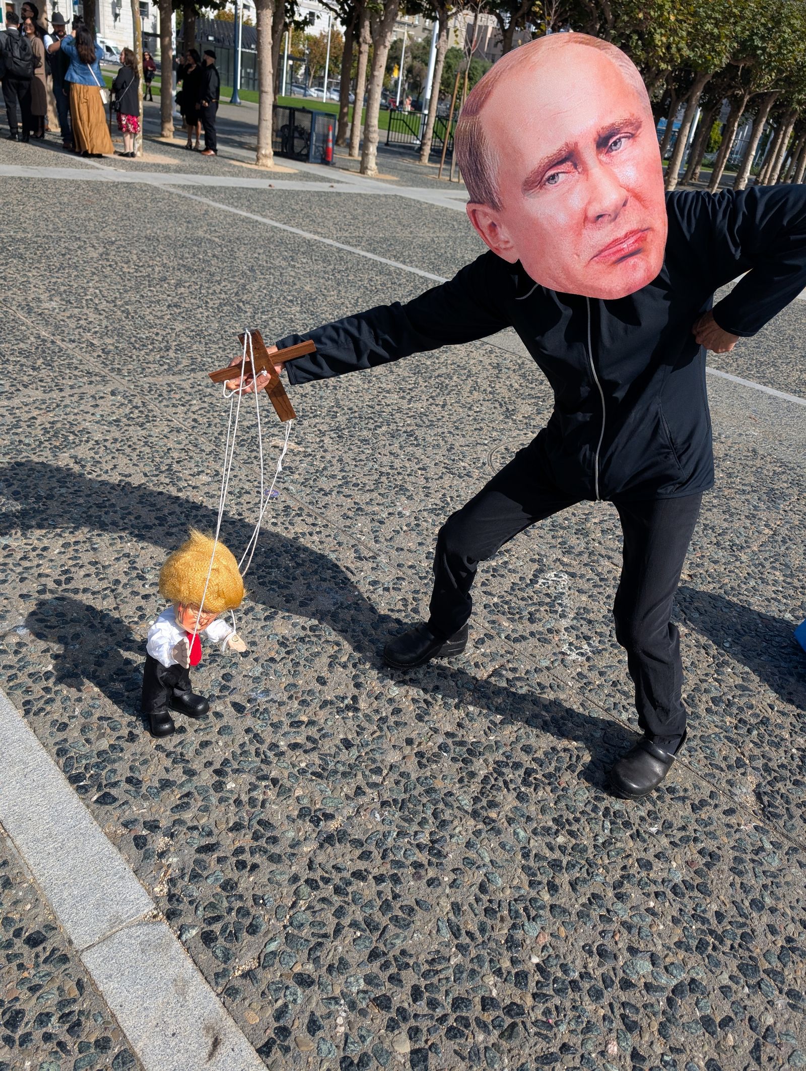 In the crowd of around 150 people, supporters held up signs that read things like “ICE Out of CA” and “We Hella Love Justice.” One woman, who said she is a longtime San Francisco resident and former circus performer, twirled around on the sidewalk in a Vladimir Putin mask with a small scowling Trump puppet dangling below her.