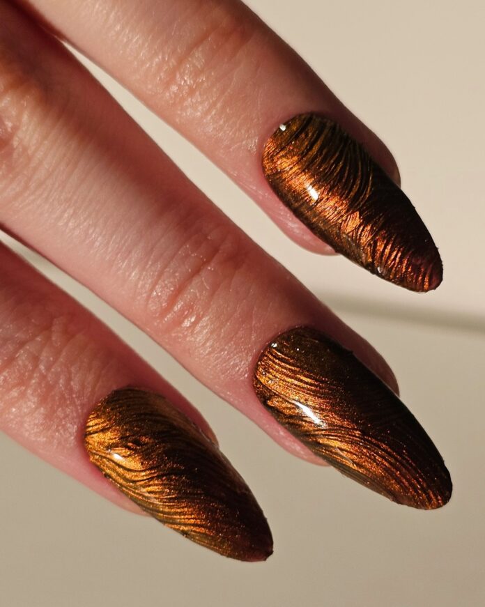 Like gossamer silk or a babbling brook, this look features a whisper of texture—lines, waves, and swirls atop hard gel are made using a textured brush (more on that in a moment). The effect is often created over a metallic base or beneath chrome dust to accentuate the ridges.