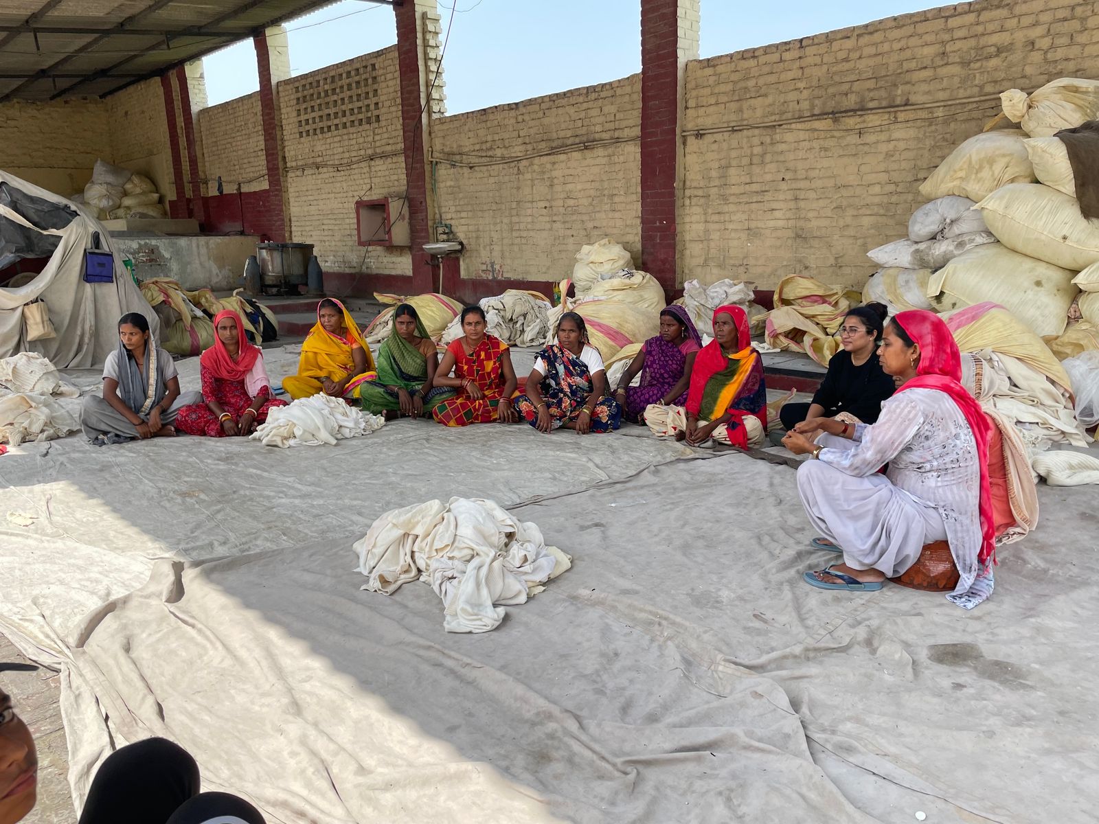 She may have wriggled free of the ties that once bound her to tradition, but the artist from Haryana has never forgotten her roots or taken for granted that her story is not as common as it should be. Through her practice, Arya remains committed to championing the women artisans who’ve inspired her and bringing their stories to fast fashion–consuming urbanites who need to hear them: the neighbouring city of Panipat has become infamous as the cast-off capital of the world, with over 20,000 recycling units processing over a million tonnes of textile waste annually and releasing uncountable air and water toxins in the process. The artist often calls in favours from friends of friends to document the stories of the women working in these factories, many of whom are forced to not only breathe toxic levels of fabric particles every day and constantly cut themselves on the rudimentary tools given to them, but also bring their children to work and expose them to the pollution due to a lack of childcare facilities in the area. “They tell me, ‘Yeh kaam bali maangta hai’ (This work demands blood),” said Arya, showing me her studio walls in Kaladham that are now lined with photographs she has taken during her site visits.