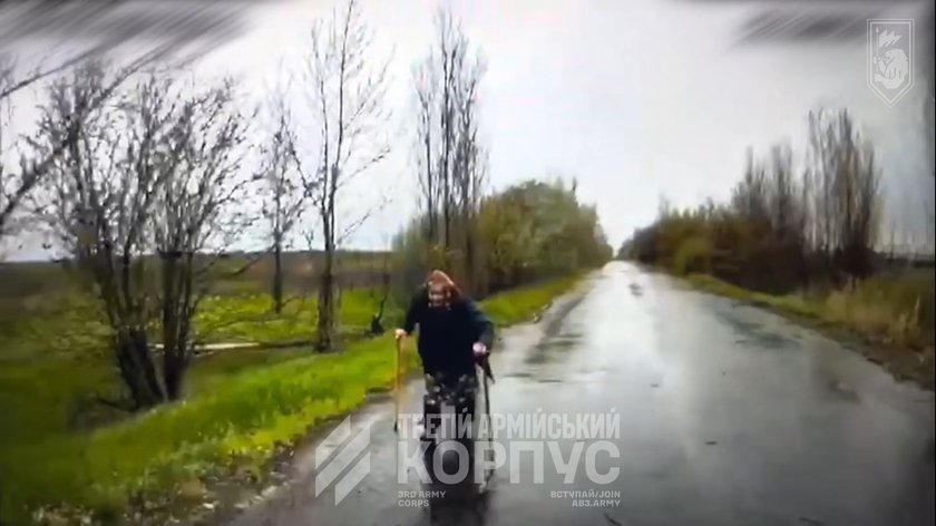 Operatorzy dronów zauważyli staruszkę na ostrzeliwanej drodze.