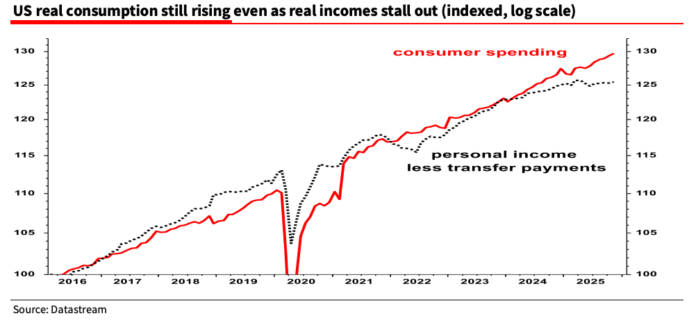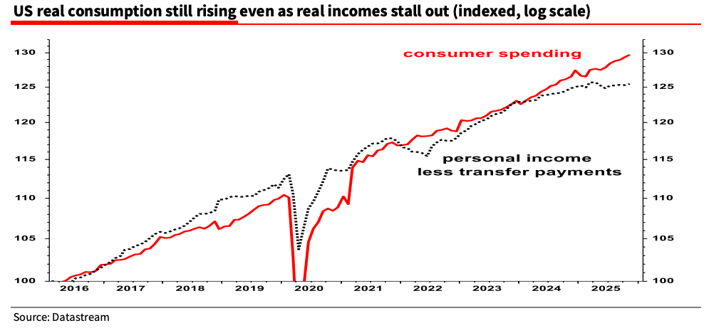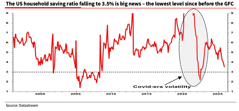 Real household incomes have been flat for roughly six months, Alberts continued, slowing sharply to just 1% year over year, while the household saving ratio has collapsed to 3.5%.