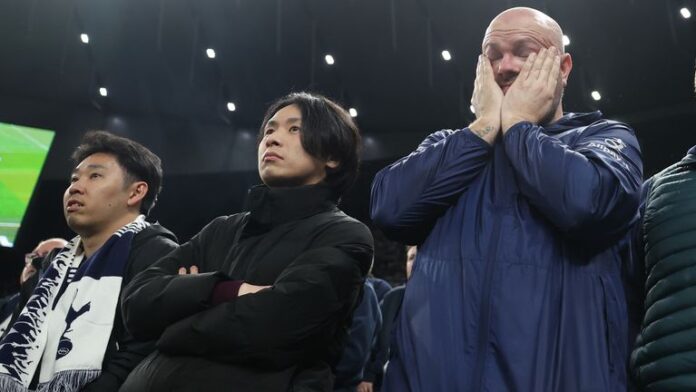 He watched as his team capitulated in front of a despairing crowd at the Tottenham Hotspur Stadium on Thursday – conceding three goals in seven first-half minutes after Micky van de Ven was sent off. Some fans were seen fleeing the ground before half-time.