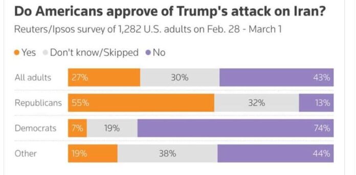 Only one in four Americans approve of the US strikes that killed Iran’s Supreme Leader, according to a Reuters/Ipsos poll, underscoring a sharp divide between public opinion and President Donald Trump’s forceful rhetoric. While Trump has portrayed the operation as decisive and widely welcomed, even inside Iran, the survey suggests significant domestic unease. Nearly half of respondents said they believe the President is too willing to use military force, raising fresh questions about the political cost of escalation.