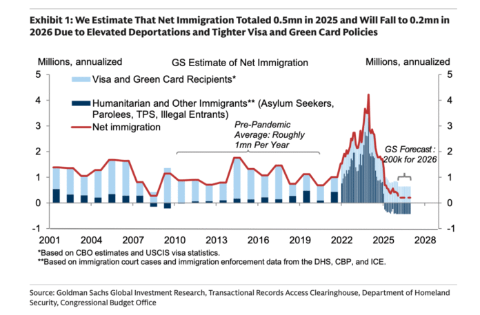 The investment bank’s U.S. economics team, in a report led by David Mericle, projected a precipitous drop in the arrival of new workers. While net immigration averaged approximately 1 million people per year during the 2010s, that figure fell to 500,000 in 2025 and is projected to plummet further to just 200,000 in 2026, Goldman said. That represents an 80% decline from the historical baseline, a shift the report attributes directly to aggressive policy changes, including “elevated deportations,” a recently announced pause on immigrant visa processing for 75 countries, and an expanded travel ban.