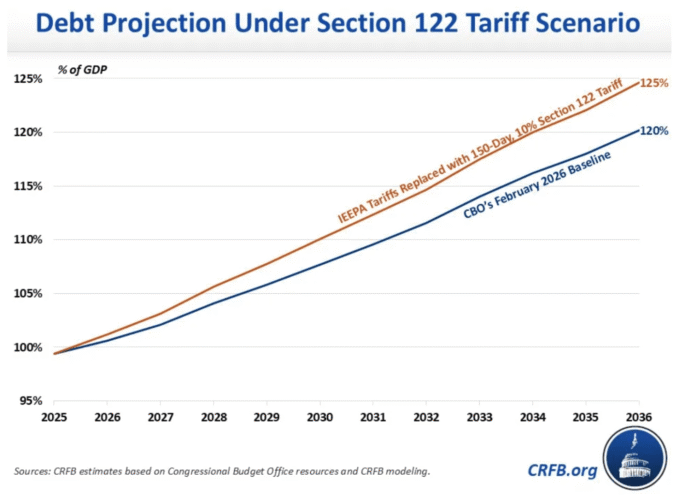 If Congress were to make the Section 122 tariff permanent, or if the administration successfully replicated it through Section 301 or Section 232 authorities, a 10% rate would generate $925 billion through 2036—recouping just over half of the $1.7 trillion lost. At 15%, the recovery rises to $1.3 trillion. Fully closing the hole would require an additional $400 billion to $800 billion in net new revenue beyond the Section 122 levels, CRFB estimated.​
