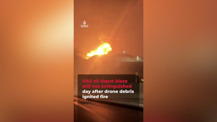 Footage shows a huge fire still raging at an oil depot in Fujairah, UAE a day after falling debris from an intercepted drone ignited the blaze.