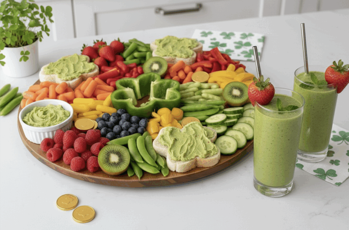 Celebrate St. Patrick’s Day with a vibrant, healthy, and fun Rainbow Snack Board! This “pot of gold” at the end of the rainbow is packed with fresh produce, shamrock-shaped treats, and a protein-packed green dip that even the pickiest eaters will love. Pair it with a refreshing Green Smoothie for the ultimate nutrient-dense celebration.