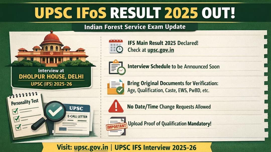 As per the official notification, the UPSC IFoS 2025–26 Personality Test (Interview) will take place at the Office of the Union Public Service Commission, Dholpur House, Shahjahan Road, New Delhi – 110069. Candidates who have qualified in the Main examination will soon be able to download their e-call letters from the official websites, upsc.gov.in or upsconline.gov.in.