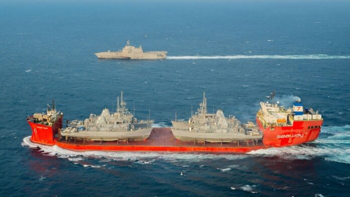 The merchant vessel Seaway Hawk sails in the Arabian Gulf while transporting decommissioned U.S. Navy Avenger-class Mine Countermeasures Ships, USS Devastator, USS Dextrous, USS Gladiator and USS Sentry. (Petty Officer 2nd Class Iain Page /U.S. Naval Forces Central Command / U.S. 5th Fleet)