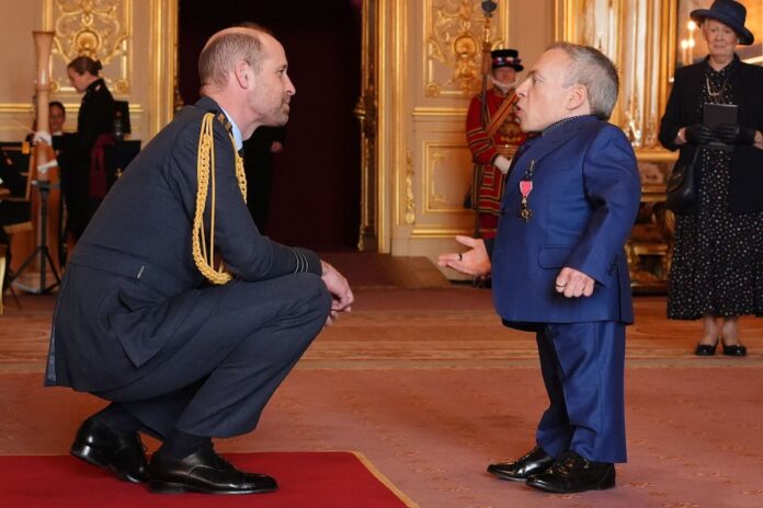 Warwick Davis beamed with pride today as he received his OBE from Prince William. The much-loved actor, 56, has been awarded the honour for his significant contributions to drama and charity.