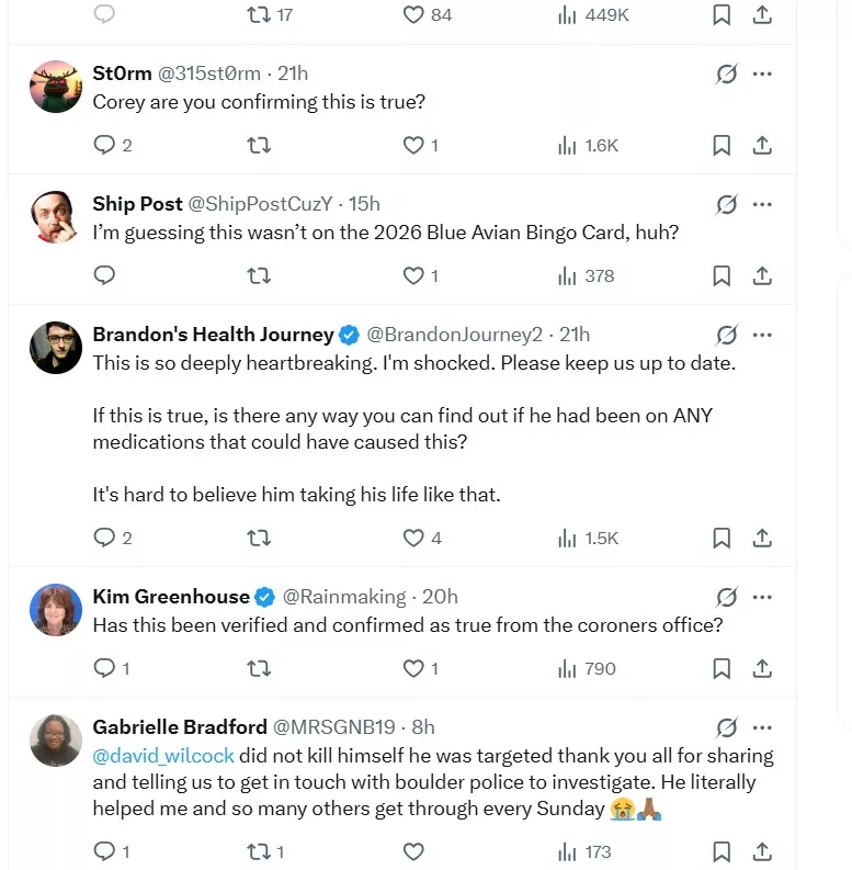 “We are shocked and horrified! We will meet with the Boulder Police to provide any information we can. The last time I spoke with him, he couldn’t stop talking about the cyber-stalkers and how they destroyed his life. I will release a video statement soon.”