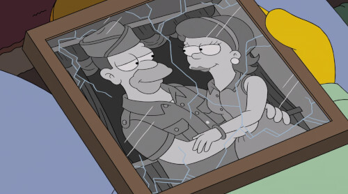 Then there’s a flashback within the flashback, in which we see Homer’s dad mooning over his estranged wife Mona. As we’ve mentioned before, Grampa’s backstory was completely upended last season after the episode “Shoddy Heat” revealed that Abe Simpson used to be a private detective in the 1980s, rather than a war hero in the 1940s.