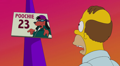 Of course, Poochie was the proactive doggy character that Homer was hired to voice in season 8’s “The Itchy & Scratchy & Poochie Show.” So in this new Simpsons reality, Poochie already existed prior to Bart’s interest in Itchy & Scratchy? Was he still voiced by Homer? And since the character’s likeness was included in the theme park parking lot signage, does that mean that he was actually popular and didn’t die on the way back to his home planet?