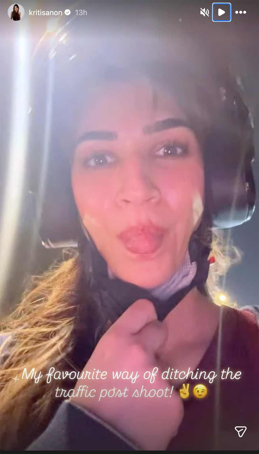 Taking to social media, Kriti posted a short video of herself travelling through the streets after pack up. In the clip, she is seen sitting on a scooty or bike while making her way through traffic. To stay incognito, the actor wore a helmet along with a black face mask so that she would not be easily recognised by fans.