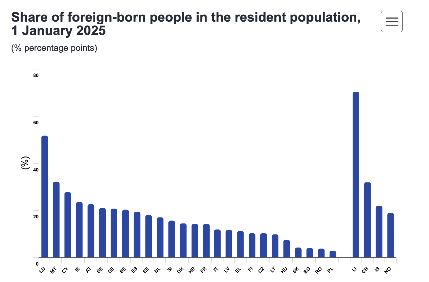 Smaller countries in Western Europe had the biggest share of foreign-born residents in 2024. In the lead was Luxembourg, where 51 percent of the total population was born abroad, in Malta some 32 percent of residents were born abroad, and in Cyprus it was almost 28 percent. In Ireland 23 percent of residents were born abroad and in Austria the figure stood at 22 percent.