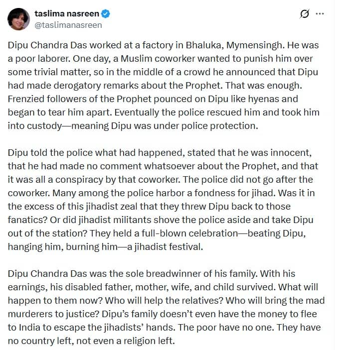 Writing on X, Nasreen stated Das was targeted by a Muslim colleague over a minor disagreement, who then publicly declared Das had insulted the Prophet, inciting the violent response.