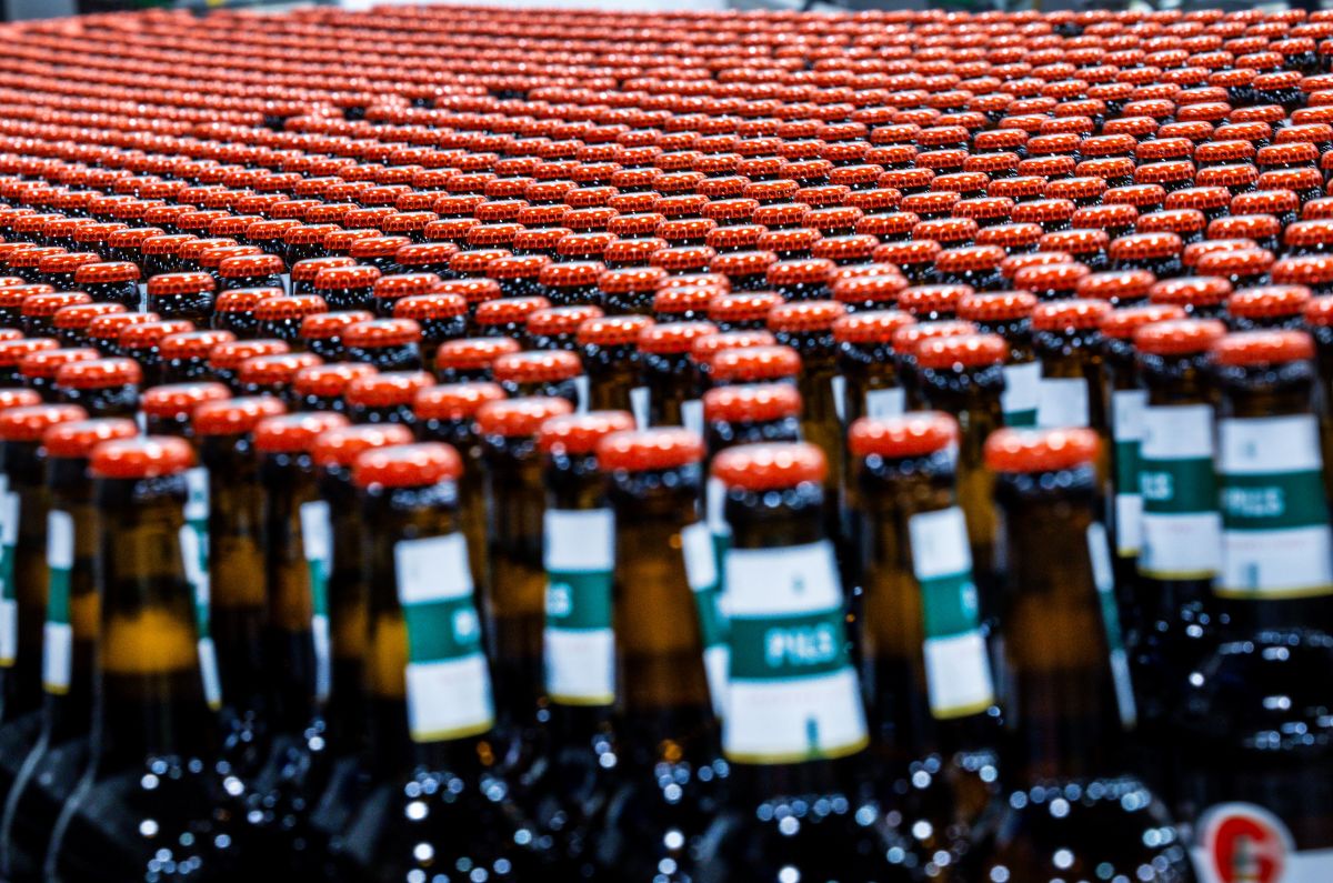 Freshly filled beer bottles run along a conveyor belt in the bottling plant of the Mecklenburgische Brauerei Lübz. Photo: picture alliance/dpa | Jens Büttner
