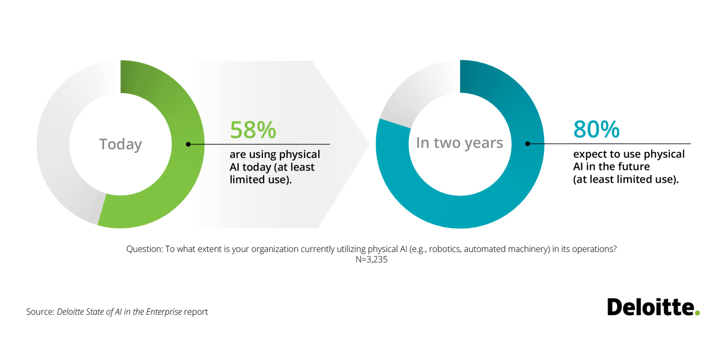 Physical AI is growing fast, but especially in the Asia-Pacific. Nearly 60% of companies report at least limited use of physical AI and within two years, that figure will increase to 80%, according to a Deloitte survey of 3,235 director- to C-suite level respondents. Physical AI is a form of industrial automation that combines AI and machine learning with sensors, controls, and robotics. The pitch to investors and enterprises is that physical AI can perform difficult tasks more efficiently than workers, especially key as the manufacturing sector consistently faces labor shortages.