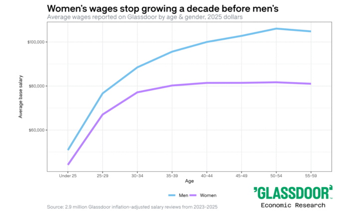 The most striking visualization in the Glassdoor report is a wage-by-age chart comparing men’s and women’s average base salaries in 2025 dollars. Men’s earnings rise in a clean, steady arc into their 50s. The women’s line bends flat in the late 30s — and stays there.