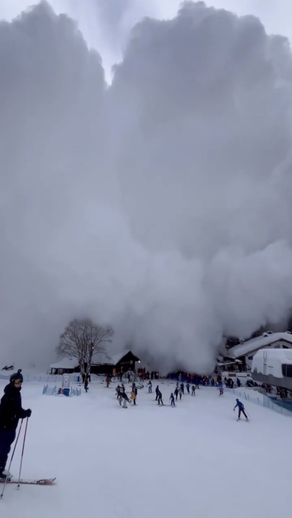 Many of the skiers at the chairlift in Val Veny initially stood still and watched as the fast-moving mass of snow barrelled towards them — but after it burst through a row of trees many started to try to flee as the cloud of powder completely enveloped them, the wild clip shows.