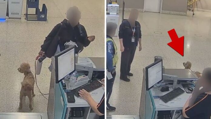 The clip then cuts to security camera footage which shows this individual arriving with her dog and stopping to chat with the woman at the checked bag desk.